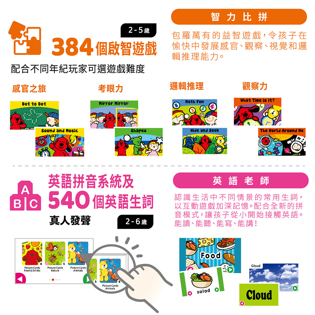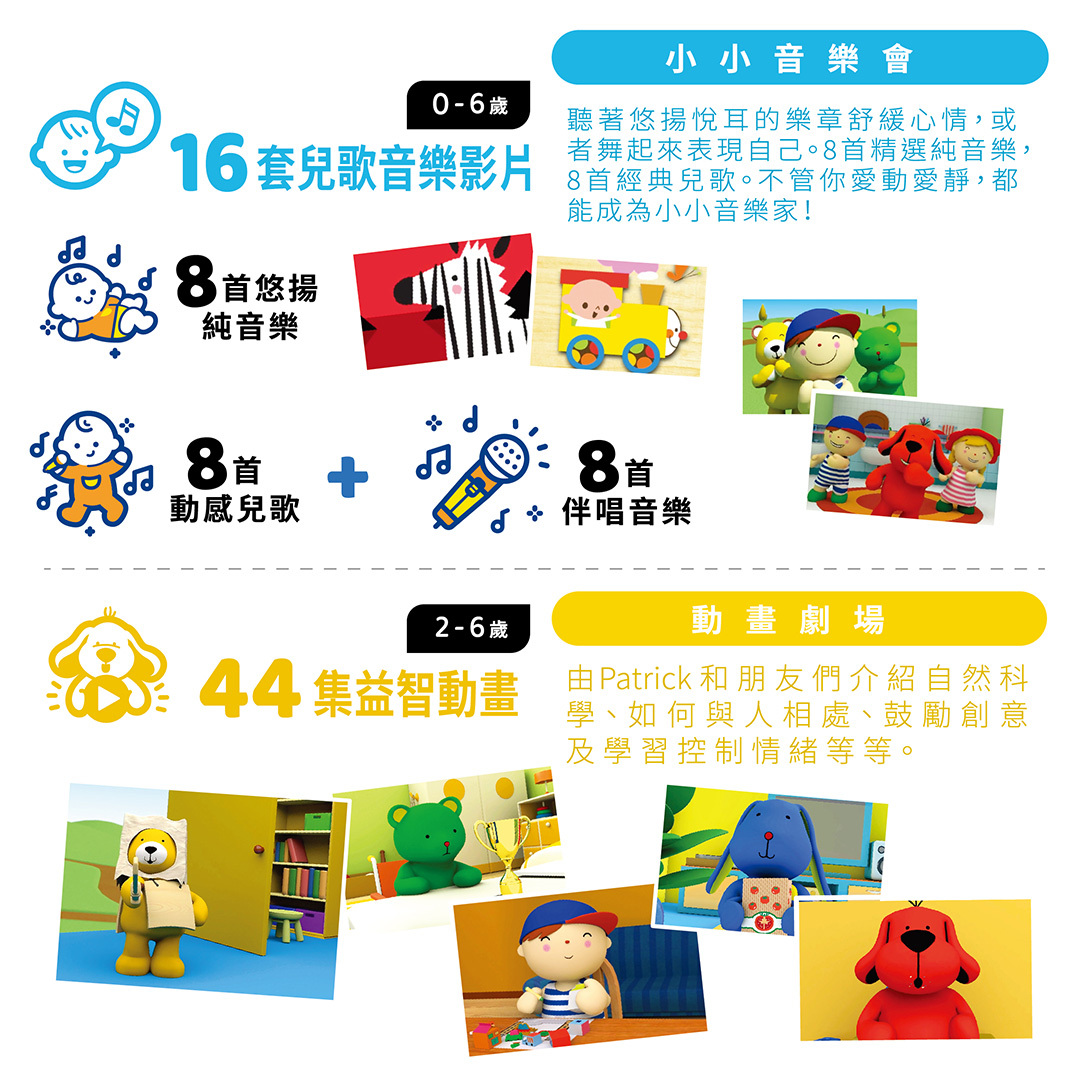 – 包括16套兒歌音樂影片、44集益智動畫、384個啟智遊戲、英語拼音系統及540個英語生詞、16套趣味教學影片以及22個電子故事書。