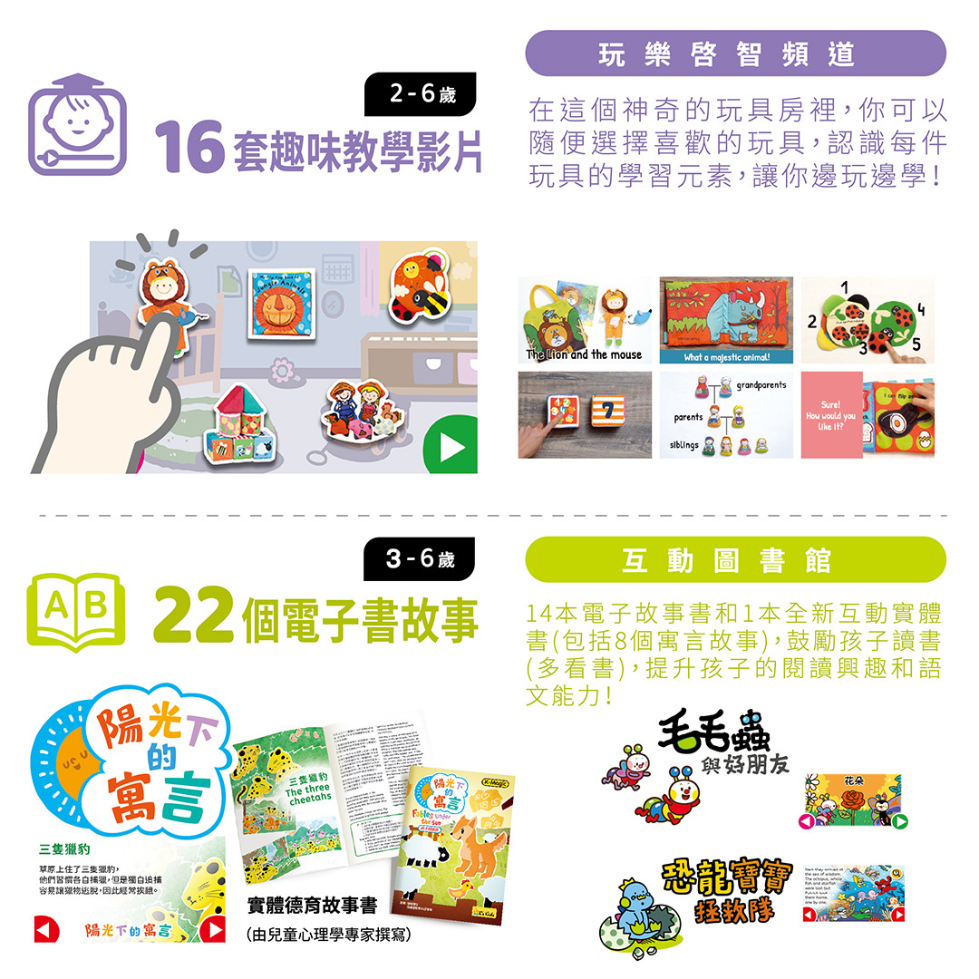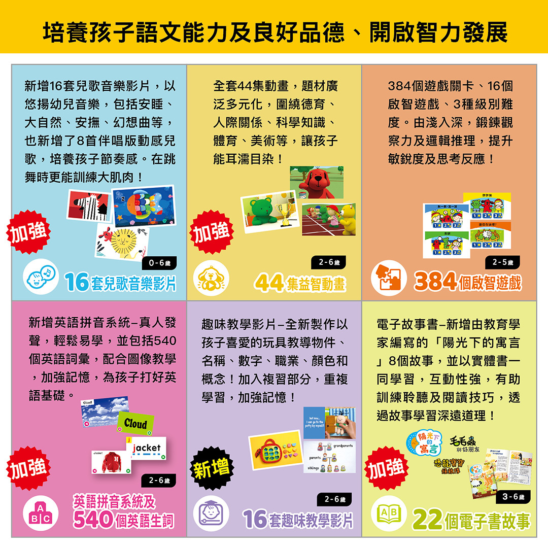 全新奇智寶盒升級版,專為初生嬰兒至六歲兒童設,增加更多更豐富的內容: